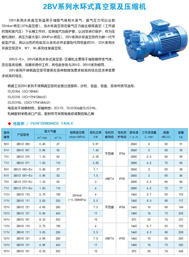 2BV水环真空泵适用于抽除气体和水蒸气,吸气压力可以达到33mbar压力(97%真空度)。当真空泵在吸气压力低于80mbar的状态下长期工作时,应联接气蚀保护管,以对泵进行保护。如配大气喷射器,吸气压力可达10mbar,喷射器可直接安装在真空泵上。作为压缩机用时,其压力大至0.26MPa。